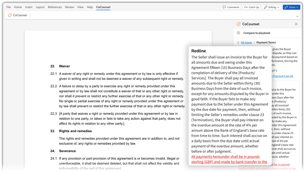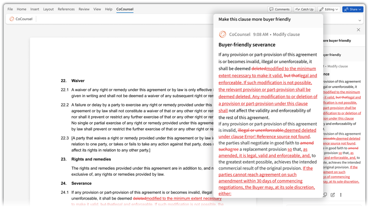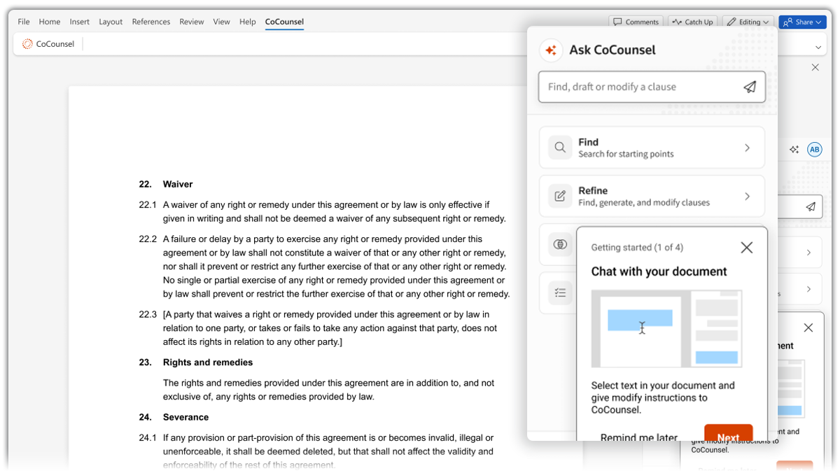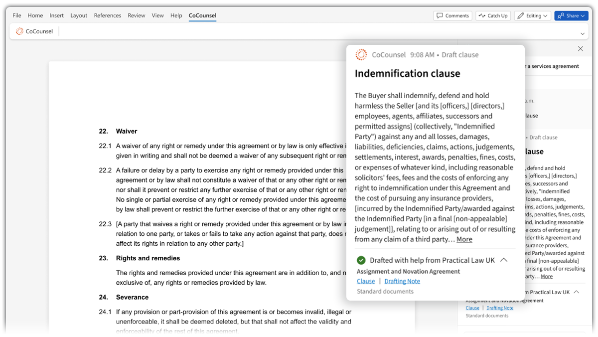 Create, review, and finalise legal documents with generative AI-powered skills from CoCounsel Drafting — all without leaving Microsoft Word