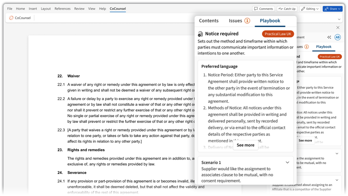 - Effortlessly create preferred or required clause language and negotiation guidance: Use your custom playbooks and/or Practical Law playbooks