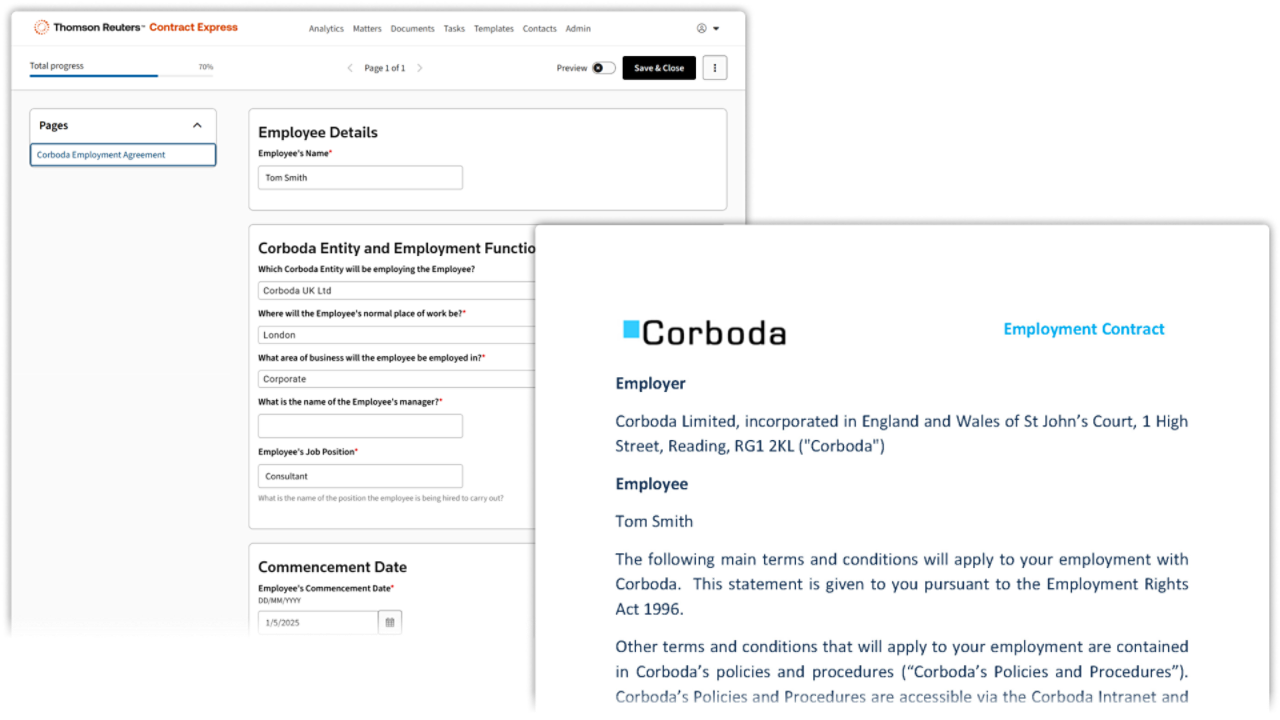 - Intuitive online questionnaire: Complete a simple, business-oriented online questionnaire to generate contracts ready for approval.
