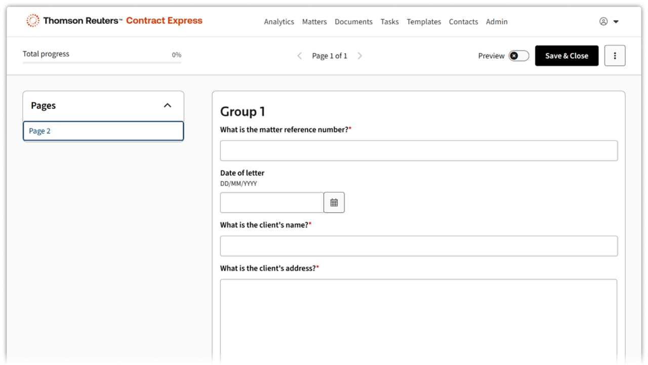 - Intelligent online form: Enable clients to complete an intelligent online form and have the Word document automatically generated and sent to a lawyer for review.