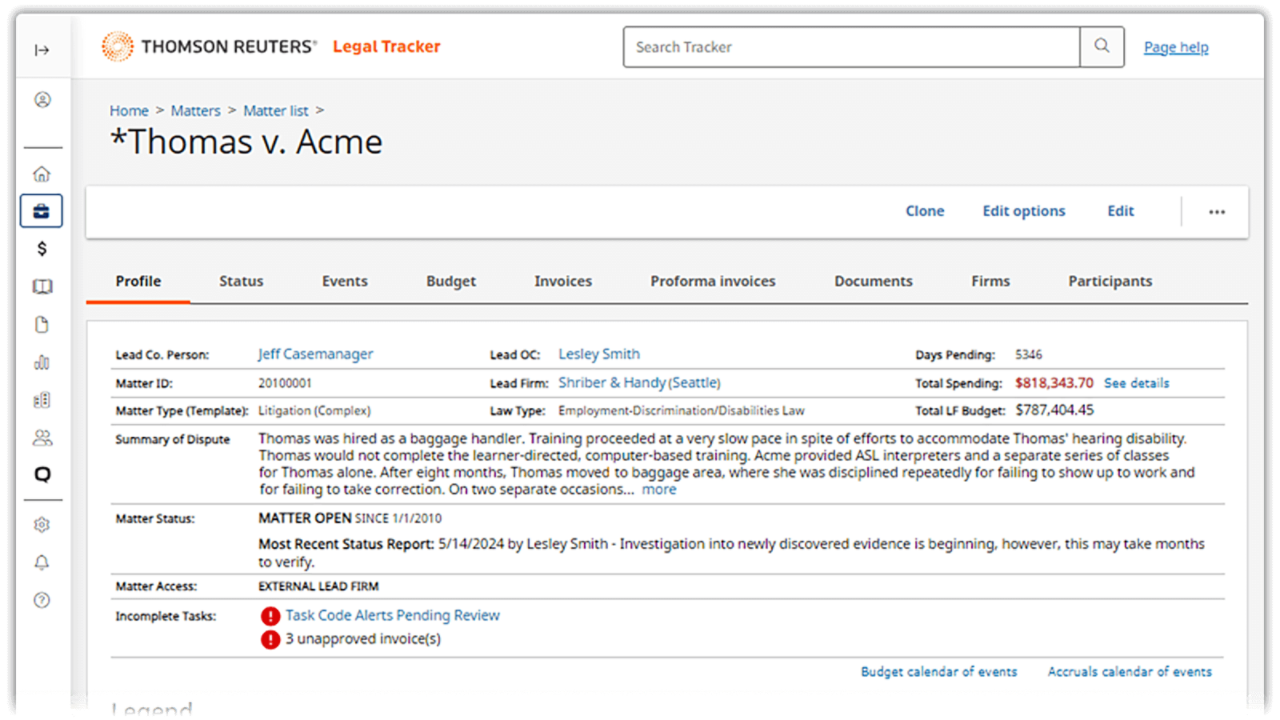 - Aligned financial oversight: Correlate financial data with specific matters ensuring that spending is directly linked to the legal work performed, improving budget management and accountability.