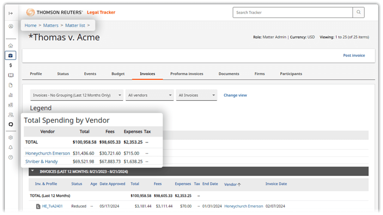 - Informed decision-making: Use matter data with associated spend to make better decisions on resource allocation and evaluate legal strategies.