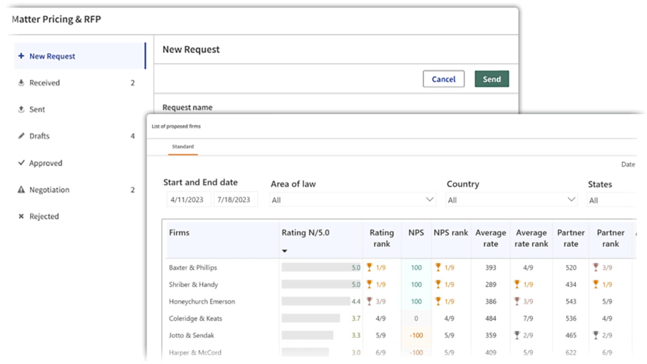 - Enhanced firm selection: Improve external counsel performance with a targeted, competitive, and objective firm selection process during request for proposal of legal services.